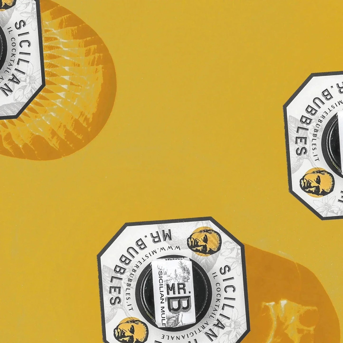 Bottiglie di Mr. Bubbles Sicilian Mule con etichette bianche e sfondo giallo brillante