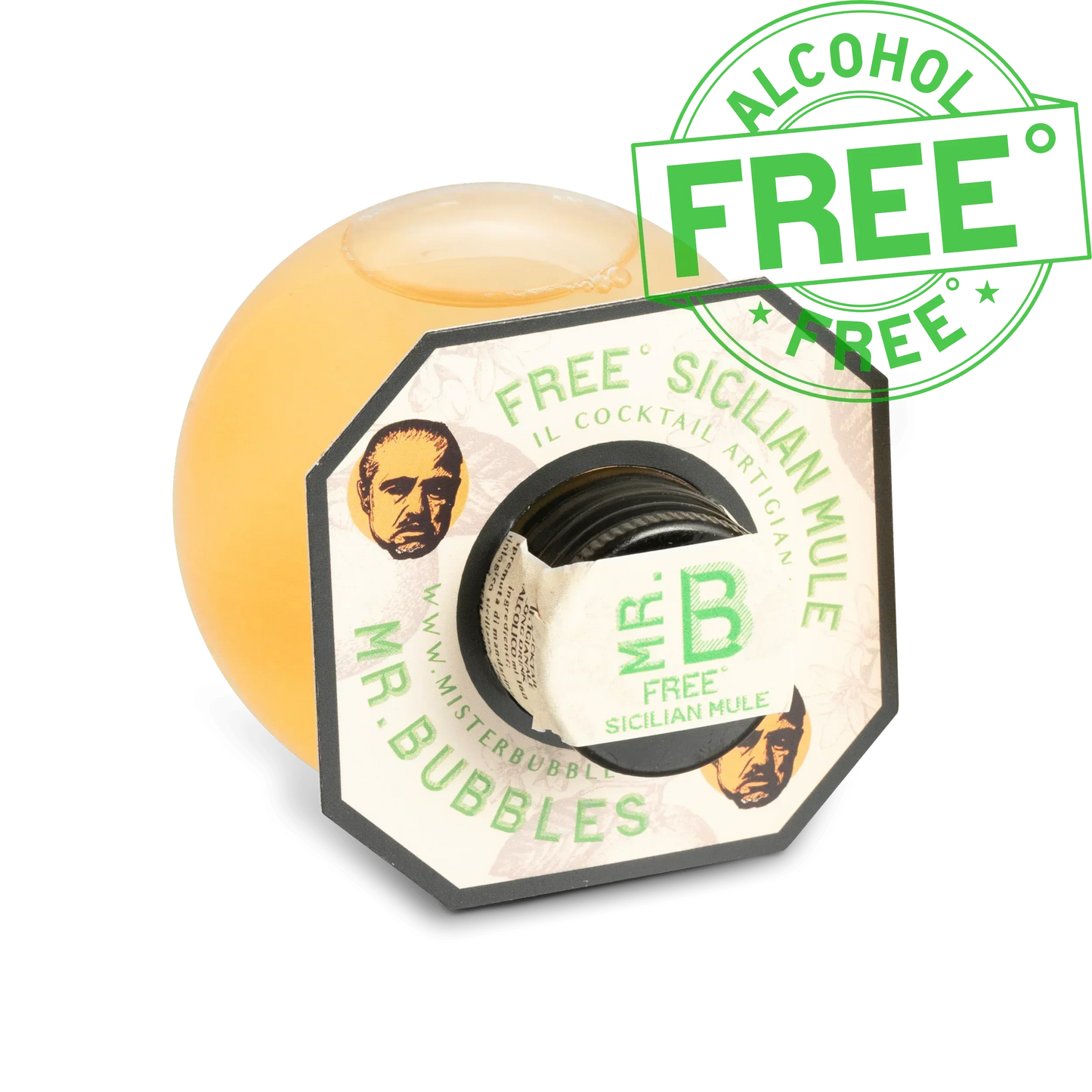 Bottiglia laterale cocktail analcolico Free Sicilian Mule Mr. Bubbles con etichetta verde